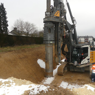 Eine Bohrpfahlwand besteht aus einer Reihe von im Boden eingebrachten, zylindrischen Betonpfählen. Diese Pfähle werden gebohrt und anschließend mit Beton verfüllt. Die Wand dient dazu, das Erdreich seitlich abzustützen und so das Baufeld vor Abrutschen oder Einsturz zu schützen – besonders wichtig bei tiefen Baugruben oder in lockerem Boden.